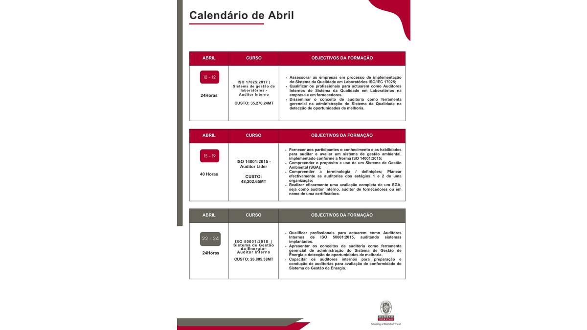 Bureau Veritas Moçambique -Training Campaign 2024 Le 22/03/2024 Documentation Télécharger Calendario_de_Formacoes.pdf (PDF • 68 Ko)