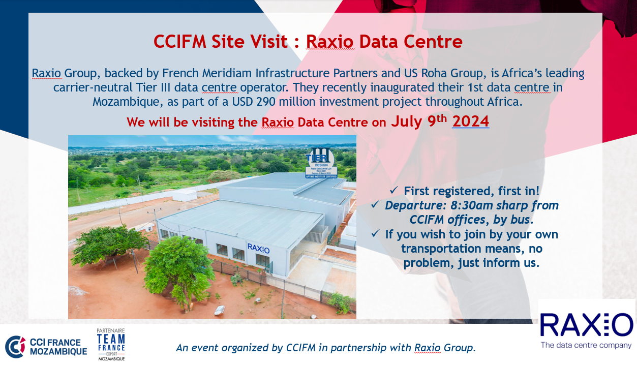 We are extremely sorry to inform you that we need to change the date of our ‘Site Visit’ of Raxio Group’s brand-new Data Centre, located in MozParks’ Beluluane Industrial Park to Tuesday, July 9th 2024 (and no longer June 27th as initially mentioned).