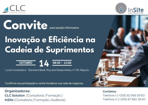 In times of increasing challenges, many companies in Mozambique are struggling with the efficiency and competitiveness of their supply chains. With this in mind, CCIFM member companies CLC Solution in partnership with Insite are inviting members of the Chamber working in the logistics sector, to the information session “Innovation and Efficiency in the Supply Chain”, on October 14, 2024, from 08h30 to 12h00, at the Standard Bank Incubator, Rua dos Desportistas, nº 119, 1º andar direito - Maputo.