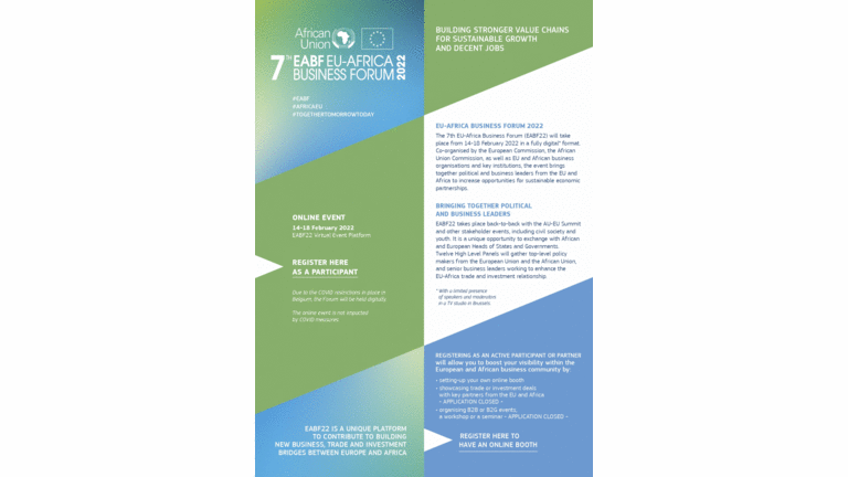 Dear Members, We invite you to attend 7th EABF EU-AFRICA BUSINESS FORUM 2022. A business event co-organized by the European Commission, the African…