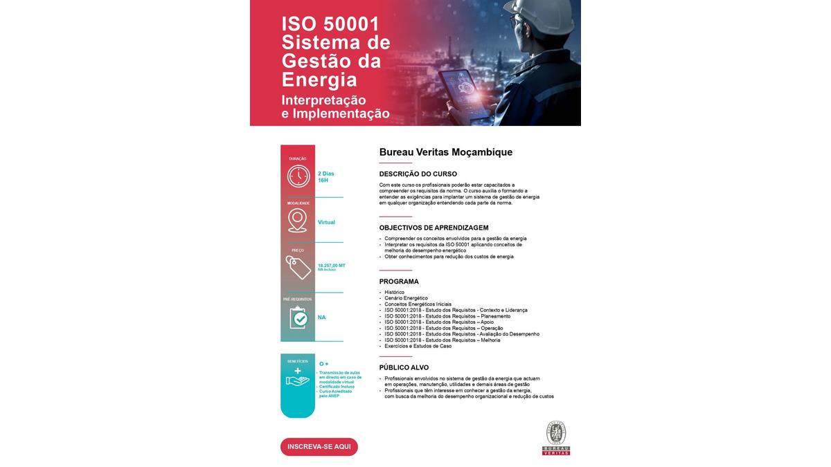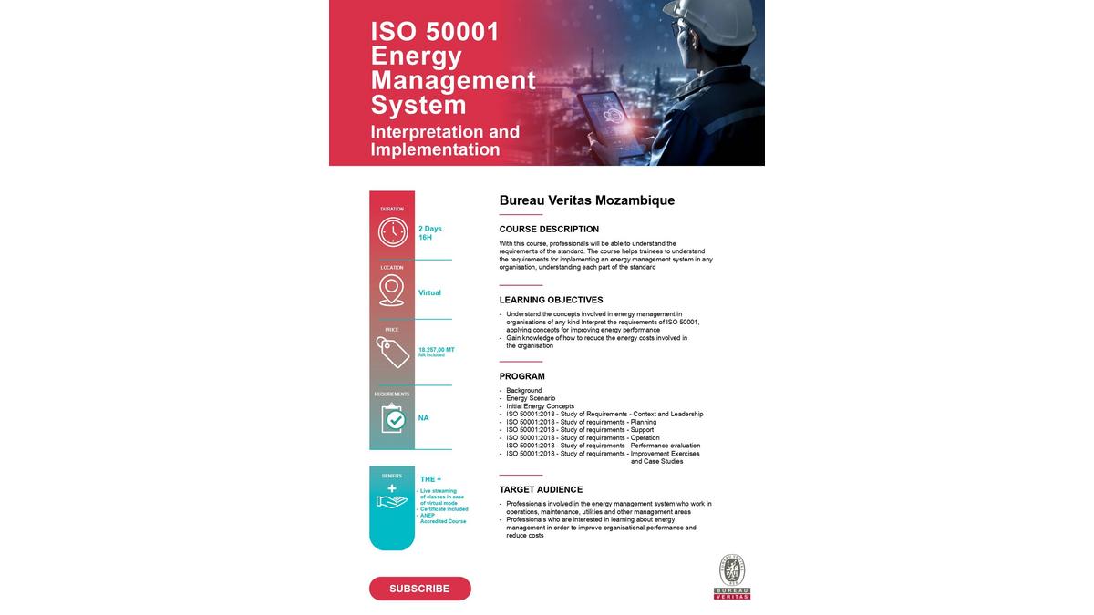 Special Training Campaign Bureau Veritas Moçambique 15 novembro 2023 Voir en mode carouselVoir en mode mosaïqueDocumentation Download ISO_14064_Carbon_Footprint_English.pdf (PDF • 172 KB) Download ISO_50001_-_Energy_Management_System_English.pdf (PDF • 163 KB) Download ISO_14064_Pegada_de_Carbono_Portugues.pdf (PDF • 172 KB) Download ISO_50001_-_Sistema_de_Gestao_da_Energia_Portugues.pdf (PDF • 187 KB)